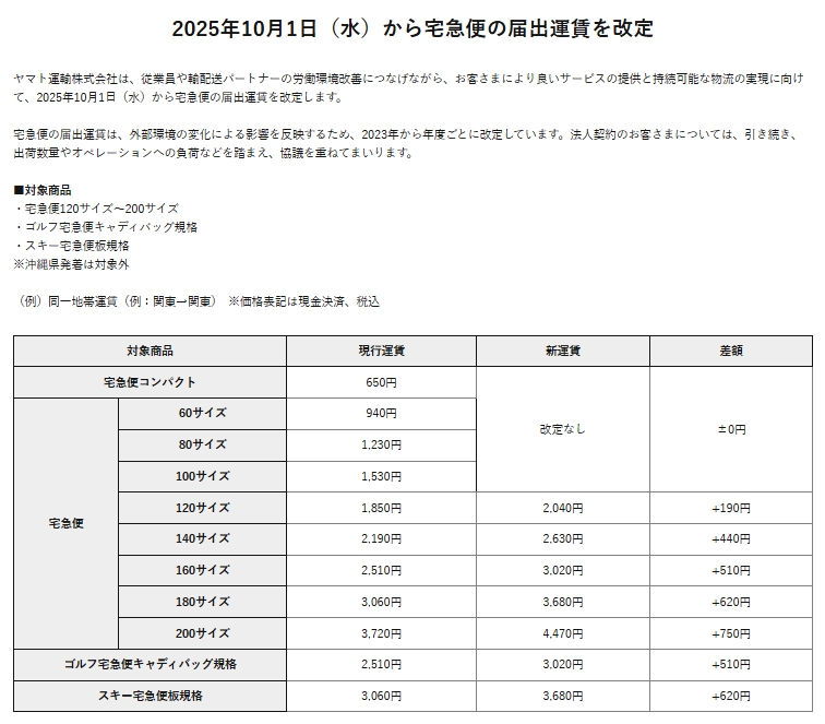 - 10月1日よりヤマト運輸配送料改定